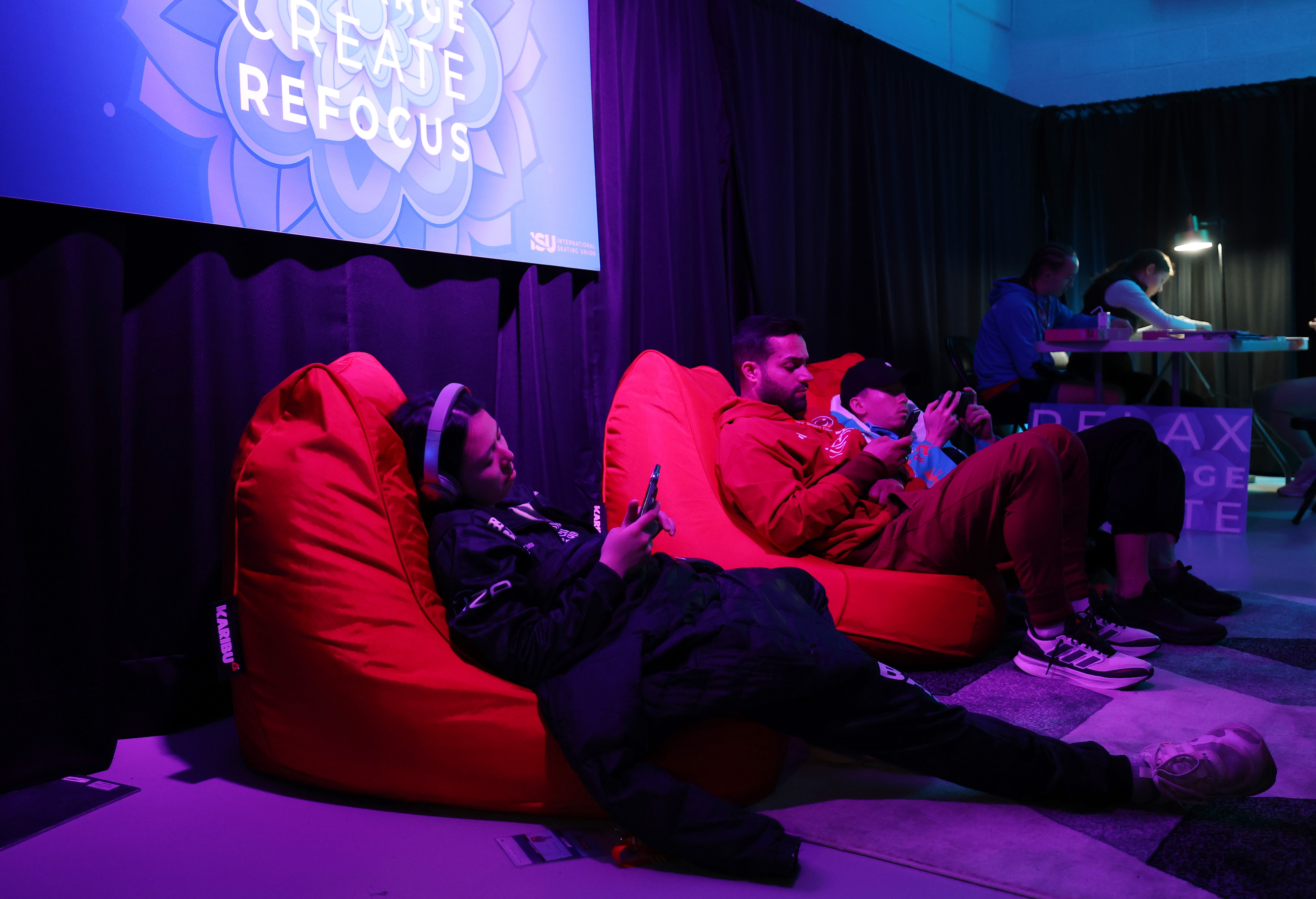 Skaters relaxing on their phones at the Calm Zone at the ISU Short Track World Tour 2025 #1 Montreal (CAN) © ISU