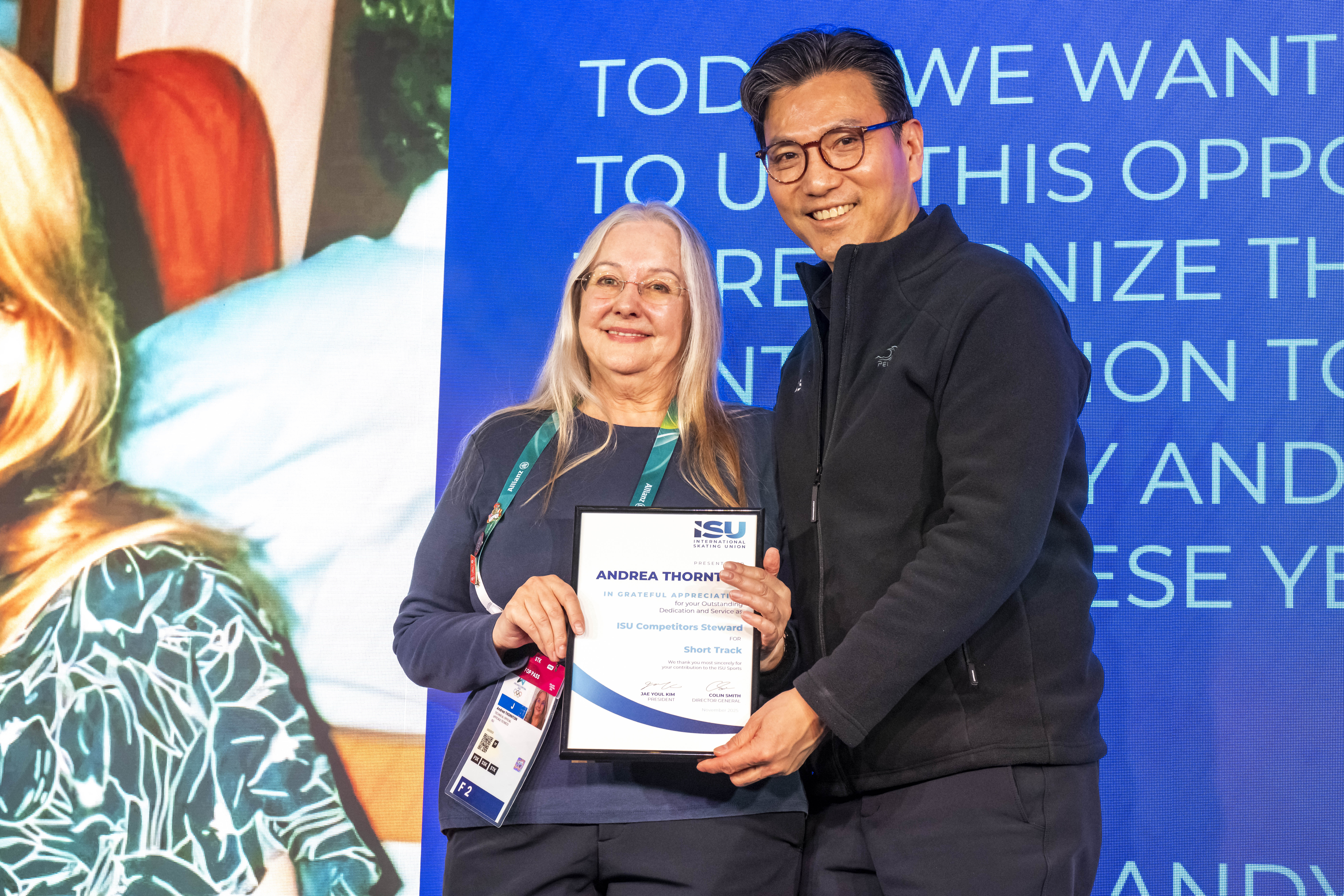 Andrea “Andy” Thornton of Great Britain was recognized for her long and respected career as a Competitors’ Steward. She officiated internationally from 1996 to 1999 and served at ISU Championships between 1999 and 2026. Before moving into officiating, Thornton competed in Short Track with Sheffield Ice Racing Skate and the Bradford Ice Speed Skating Club.