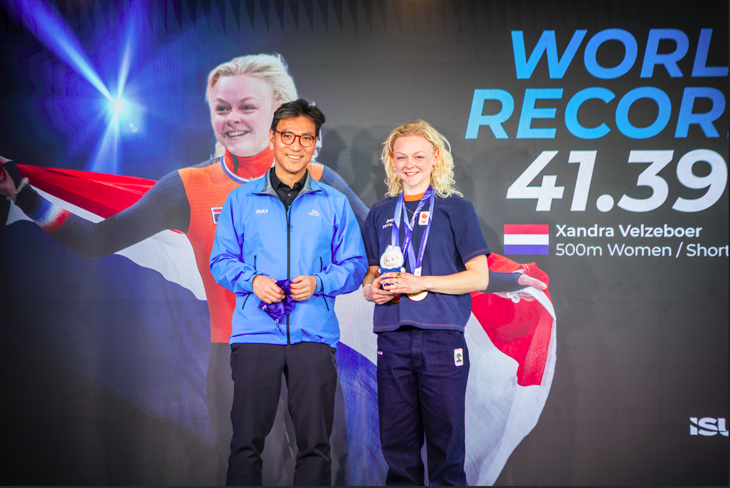 Her time of 41.399 seconds set a new benchmark for the sport and further cemented her status as one of the fastest athletes in Short Track history. Velzeboer was also the first Short Track athlete to receive a World Record ring presented by ISU President Jae Youl Kim at the Home of Skating in Milan.